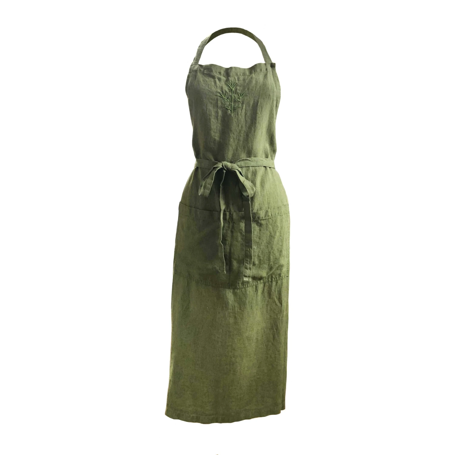 The aprons are adjustable at the neck and have a large pocket on the front. They are elegantly long but can be folded up when tied.